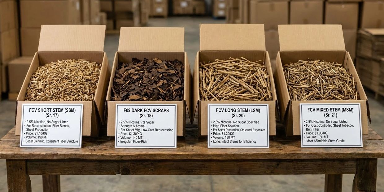 Looking for cost-effective, high-yield tobacco grades for reconstitution, filler expansion, or tobacco sheet manufacturing? Our FCV Special Grades are carefully developed to serve large-scale industrial needs — offering consistent quality, fiber-rich structure, and low-nicotine options ideal for reprocessing and mass-market formulations.