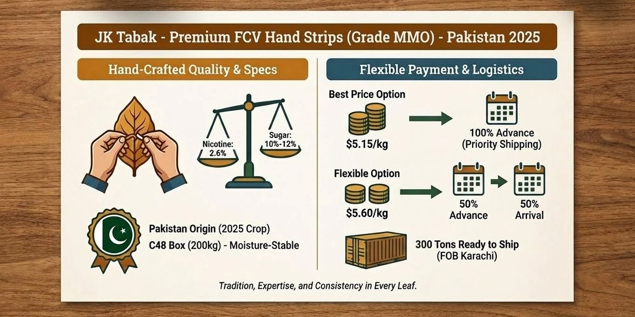 Ready to secure premium FCV Hand Strips from Pakistan’s most trusted supplier? Contact JK Tabak today and let our expert team assist you with detailed product specifications, pricing guidance, and shipping support tailored to your business needs.